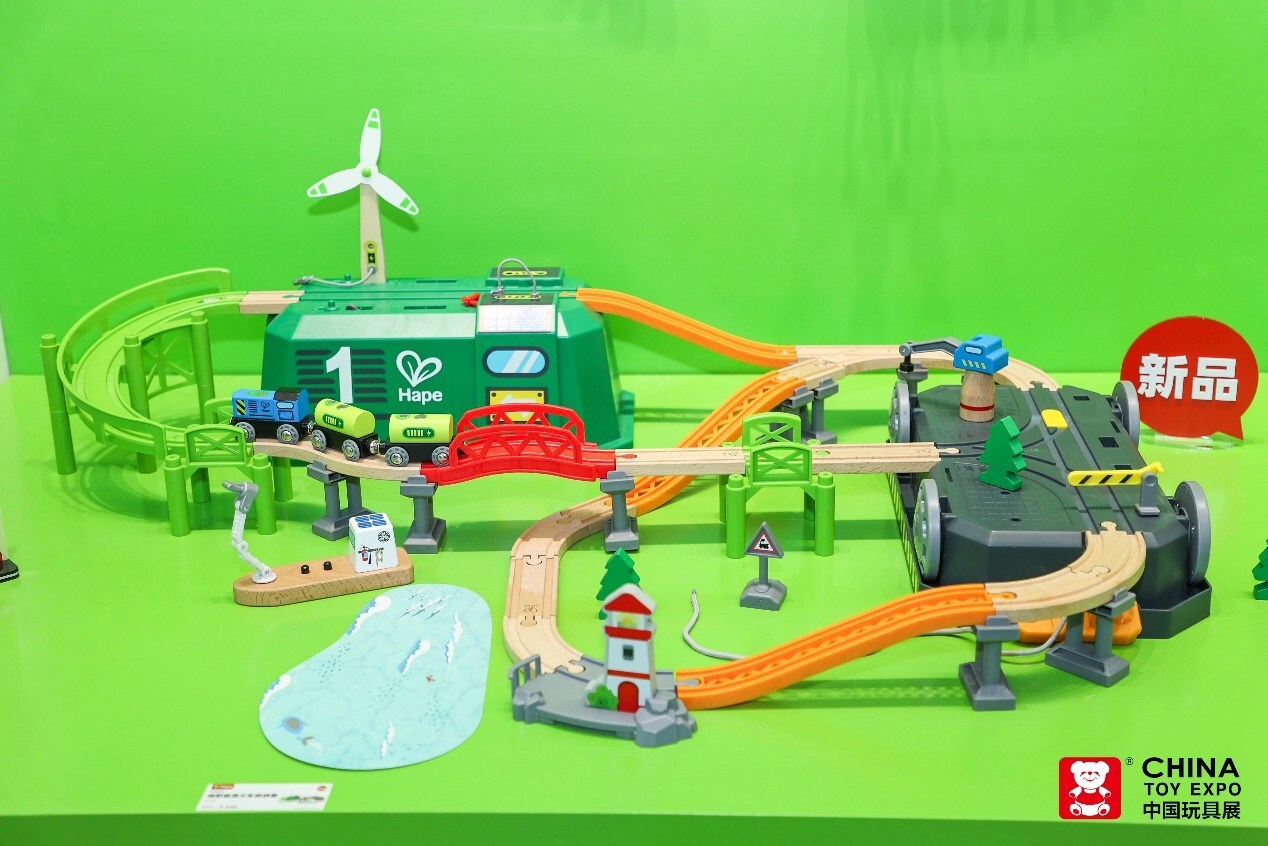 同时,今年的STEAM展示区依然不乏Hape的身影。"趣味数字收纳卡车套"将数字认知与收纳功能结合,让儿童在卡车收纳游戏中自然完成数字启蒙;"超能科学物理实验台玩具"内置电路、磁力、力学等多模块实验装置,助力儿童在动手实践中培养科学思维。此外,首发新品展示区的"绿野能源火车收纳套",以"绿色能源"为主题,将轨道玩法与太阳能、风能认知结合,在收纳设计中传递可持续理念,成为新品类创新标杆。
